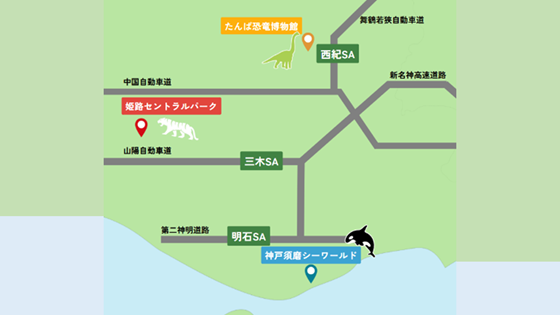 | 【対象SA】 | ●「三木SA」上下線(山陽自動車道) →姫路セントラルパークとコラボ ●「明石SA」上下線(第二神明道路) →神戸須磨シーワールドとコラボ ●「西紀SA」上下線(舞鶴若狭道) →たんば恐竜博物館とコラボ |