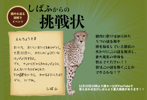 | 【詳細】 | 【エサやり体験】 ■ホワイトライオン 料金500円 平 日 13:00~13:30 土日祝 11:30〜12:00 13:00〜13:30 各先着30組様 ホワイトライオン展示場 ■『THE TIGER』ホワイトタイガー 料金1000円 平 日 14:00~14:30 土日祝 12:00〜12:30 14:00〜14:30 各先着30組様 ホワイトタイガー展示場 ■レッサーパンダ 料金300円 ※雨天中止 毎日 13:00〜 売切れ次第終了 レッサーパンダ展示場 ■コツメカワウソ 月土日祝のみ 料金500円 1回目 11:30〜 2回目 13:45〜 売り切れ次第終了 ※大雨中止 カワウソ展示場 ■ワラビー 料金300円 ※雨天中止 土日祝 12:00~ 売切れ次第終了 カンガルー広場 ■ケープペンギン 料金500円 ※雨天中止 土日祝 11:00~ 売切れ次第終了 ペンギン展示場 ■キリン 料金300円 ※大雨中止 毎日 売切れ次第終了 サバンナテラス ■ダチョウ ※鳥インフルエンザ感染防止対策の為 展示中止中 ■クマ 料金300円 毎日 売切れ次第終了 ベアバレー ■カピバラ 料金300円 不定期開催 売切れ次第終了 カピバラガーデン ■ヒツジ・ヤギ・ポニー 料金300円 毎日 閉園1時間前まで 売切れ次第終了 チャイルズファーム ■コールダック ※鳥インフルエンザ感染防止対策の為 屋外展示中止中 【乗馬体験】★3歳から12歳までのお子様限定★ ■ポニー 料金500円 ※雨天中止 ① 11:00~12:00 ② 14:00~15:30 (各終了時間の10分前受付終了) チャイルズファーム 【ふれあい体験】チャイルズファーム ■大型犬 体験料金無料 ※雨天中止 毎日 11:00〜12:00 13:30~14:30 ■モルモット 体験料金無料 ※雨天中止 平 日 14:00~15:00 土日祝 13:30〜15:00 エサやり体験もあり もぐもぐ棒1本 200円 売切れ次第終了 【飼育員トーク】料金無料 ※雨天中止 ■マーラ 毎日 12:00〜 チャイルズファーム青空広場 ■カピバラ 毎日 13:00〜 カピバラガーデン ※各種イベントは、現金のみの対応となります。 |