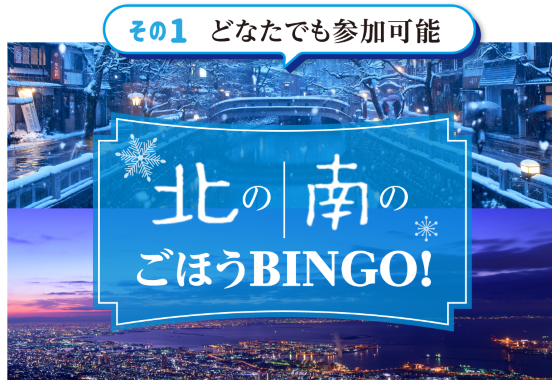 | 【その1】 | 「ごほうBINGO!」 北エリアと南エリアの2種類 ◆参加対象者 どなたでも参加可能 ◆参加方法 ①WESTERアプリの「おトクにGO!」から 「ごほうBINGO(北・南)」にアクセス ②各スポットを訪れてスタンプをGET! ③アンケートに答えるとWESTERポイントや ひょうごの特選品など抽選で素敵な賞品が当たる! |