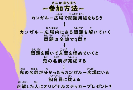 | 【参加方法】 | ① カンガルー広場で問題用紙をもらう ② カンガルー広場内にある問題を解く (全部で9問!) ③ 問題を解いて言葉をうめていくと 鬼の名前が完成する ④ 鬼の名前をカンガルー広場にいる 飼育員に教える ★正解した人にはオリジナルステッカーをプレゼント! |