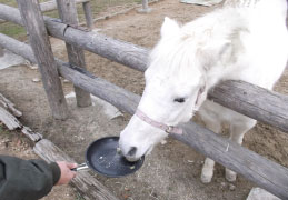 ウマは直接手で餌を上げると噛むことがあります。餌やり用のフライパンを用意していますので、そちらをご利用ください。